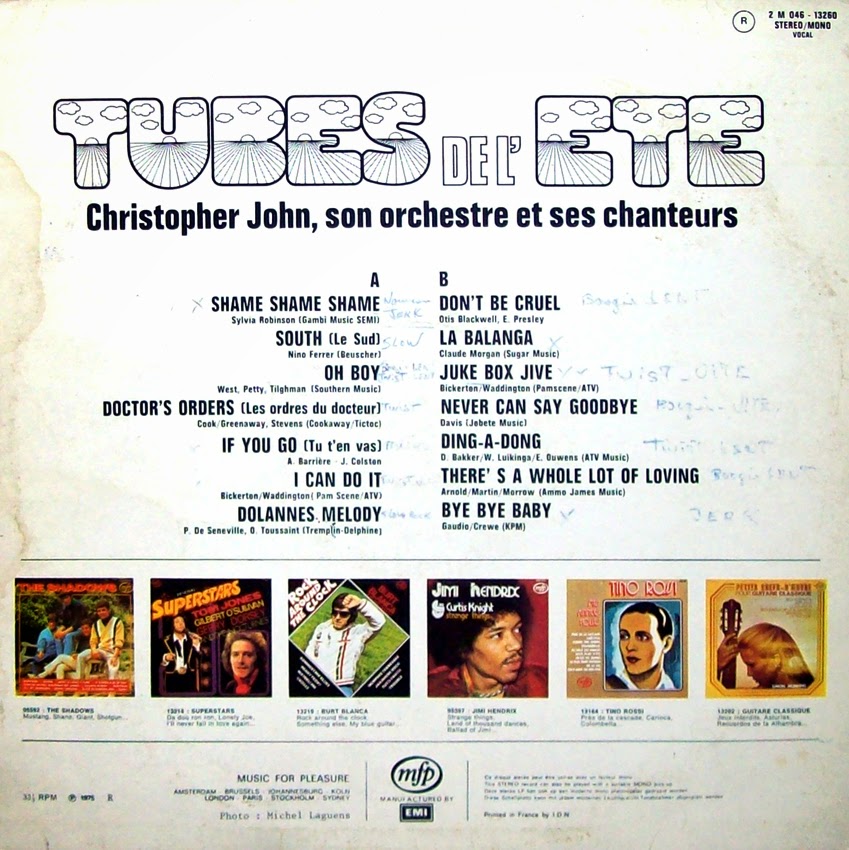 Je pense que vous serez satisfait du son de ce Christopher John. En plus la tracklist est d'enfer ! 2 titres des Rubettes (youpi !!!), dont une version pétaradante de "Juke Box Jive". Des reprises en anglais, "Le sud" et "Tu t'en vas". Je crois que ça doit être le seul orchestre à avoir osé ! "Oh Boy" de Mud, un excellent groupe de l'écurie Chinn and Chapman (Sweet, Suzi Quatro, etc....), méconnu en France.